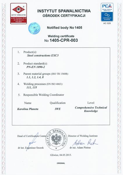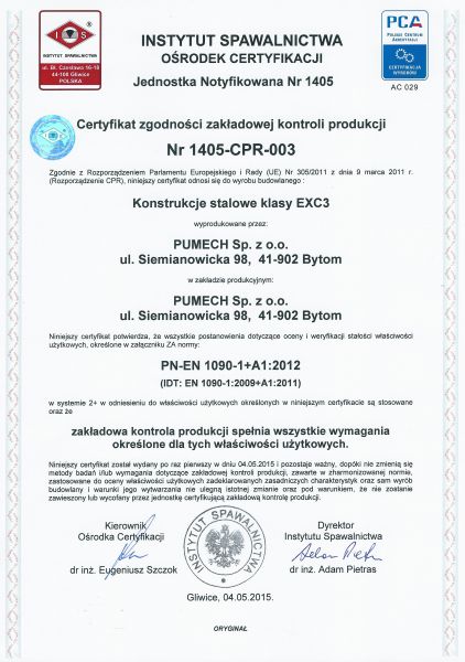 Spółka z satysfakcją informuje, że w dniu 01 kwietnia 2015 roku zakończyła pozytywnie proces certyfikacji Zakładowej kontroli produkcji wg normy PN-EN 1090 EXC3.